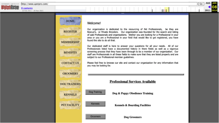 На сайте компании было указано, что проект работает с 2019 года, но по данным ВебАрхива еще в 2021 году на домене размещалась информация о компании, которая занимается профессиональным уходом за животными.