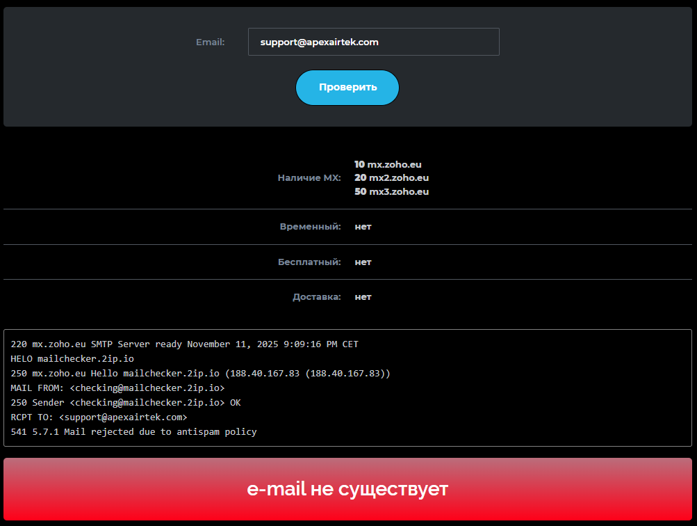 Но если начать проверять указанную информацию, то оказывается, что тут много неверных данных и откровенных фейковых заявлений. Дата регистрации домена показывает, что сайт компании появился в 2019 году, а не в 2017. Но тут большего внимания заслуживает дата обновления сайта, так как это было в июне 2025 года. Подобные перемены характерны для мошенников, которые выкупают старые сайты и переделывают их под скам-биржи. Еще одним подозрительным фактором в работе является то, что адреса электронной почты support@apexairtek com не существует.