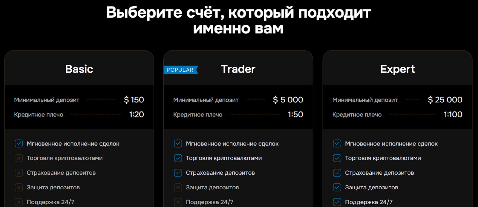 - Expert – минимальный вклад составляет 25 тысяч долларов, кредитное плечо будет 1:100.