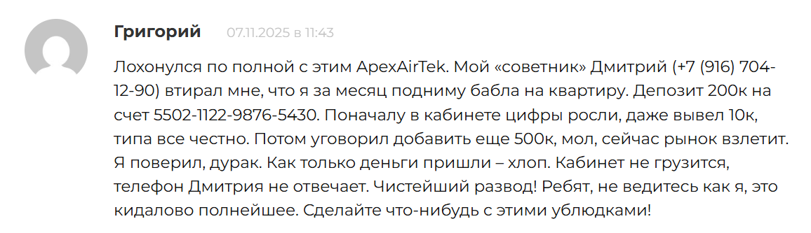 - биржа apexairtek отзывы получила только негативные и все не ранее 2025 года;