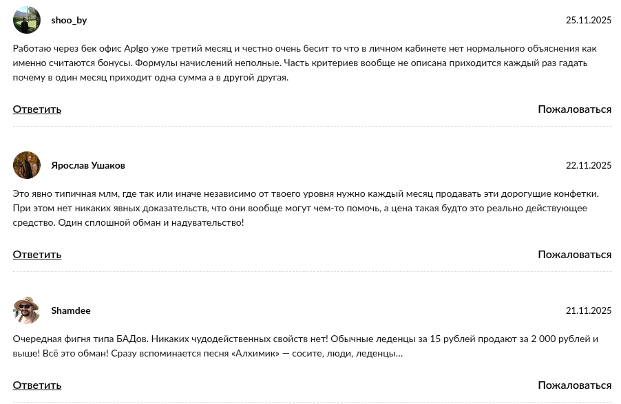 Изучая отзывы об aplgo com («Бэк Офис»), можно заметить четкое разделение мнений. Первое – это действующие партнеры, чьи комментарии напоминают мантры. Они пишут о «семье», путешествиях и невероятном исцелении от всех болезней благодаря драже. Это неудивительно, ведь Телеграмм-канал @aplgo official позиционирует сообщество именно как «СЕМЬЮ», которая «поможет достичь дерзких целей». Такая риторика характерна для закрытых комьюнити с признаками культа.