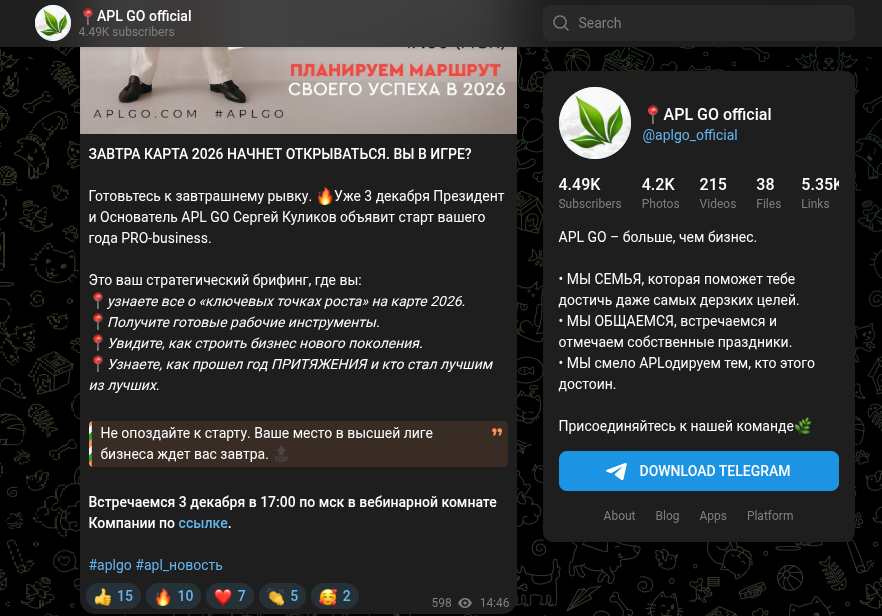 Официальный Телеграм-канал проекта (@aplgo official) напоминает не столько новостную ленту серьезного бизнеса, сколько доску объявлений закрытого клуба. В описании профиля администраторы сразу заходят с козырей, заявляя: «МЫ СЕМЬЯ», которая поможет достичь любых целей. Эта манипулятивная установка на «родство» прослеживается во всем контенте. Аудиторию из 4 500 человек постоянно прогревают фотоотчетами с мероприятий, где счастливые лидеры со сцены учат «харизме» и правильному построению команд.