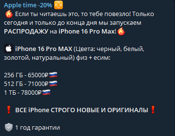 Эппл тайм продают по супер выгодным ценам айфоны и какую-то другую технику вроде. Я не углублялся в их работу. Поскольку знаю таких шустряков, которые открывают онлайн магазины на базе телеги , ставят минимально низкие цены, придумывают акции чтобы заманить. А потом просто испаряются с вашими деньгами. И у всех у них всегда предоплата за товар и нет иных условий. То есть их задача выманить с вас средства как можно быстрее. Для этого создают разные акции ограниченные по времени. Не ведитесь на эту ловушку