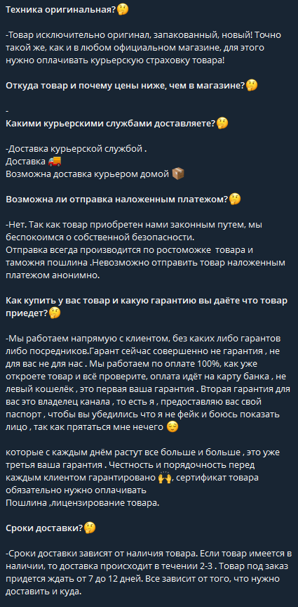 Происхождение товара: На главный вопрос ответа нет. В FAQ этот пункт обрывается на тире. Объяснений не дают. Видимо не смогли придумать правдоподобную версию. Для заказа нужно: ФИО, полный адрес, телефон, точную модель товара.