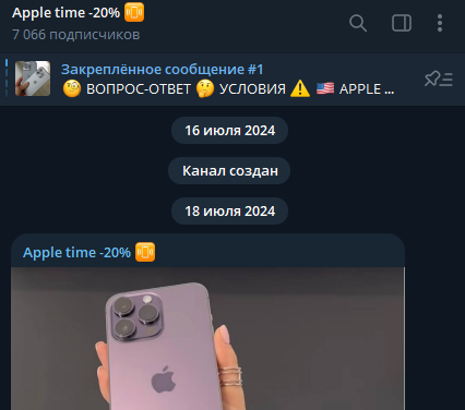 Телеграм-канал Apple Time 20 создали 16 июля 2024 года. Сейчас у него 7000 подписчиков. Каждый пост набирает около 1200 просмотров. Все заказы принимает seller anastasiya. Она же консультирует покупателей. У проекта есть второй канал europa d. Там размещают полный каталог товаров. Основная работа идет в главном канале.