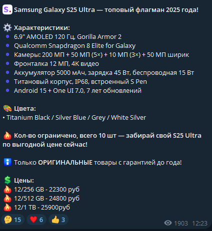 - Samsung Galaxy S25 Ultra 256GB – 22300₽;