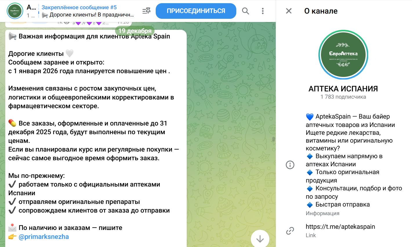 Обзор проекта Аптека Испании в Телеграм: отзывы покупателей, условия приобретения лекарств
