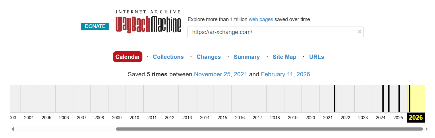 Чтобы узнать более точную информацию, мы зашли на Web Archive, но здесь вместо снимков Ar-Xchange com только пустые страницы, а единственная рабочая ссылка показана в 2026 году.