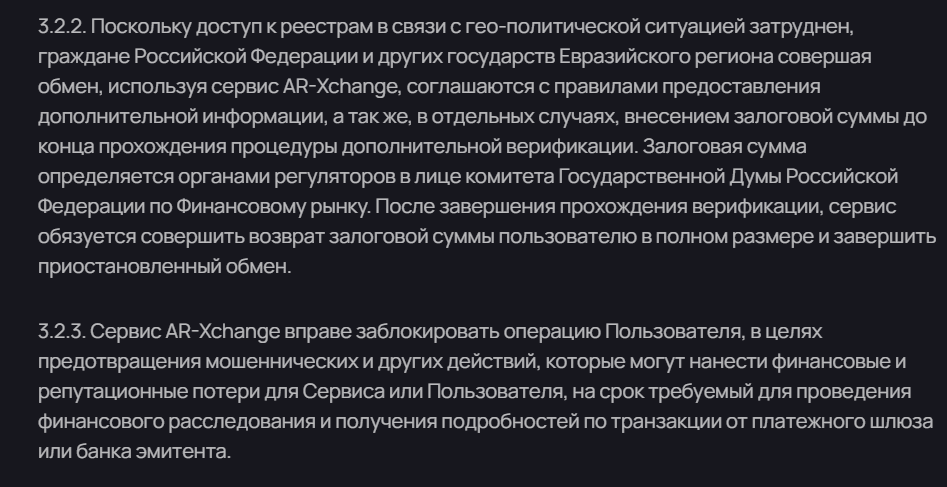 В одном месте написано про комиссию 1%, в другом 0,3%, но на самом деле пользователям Ar-Xchange придется заплатить гораздо больше, например, гражданам России нужно внести залог.