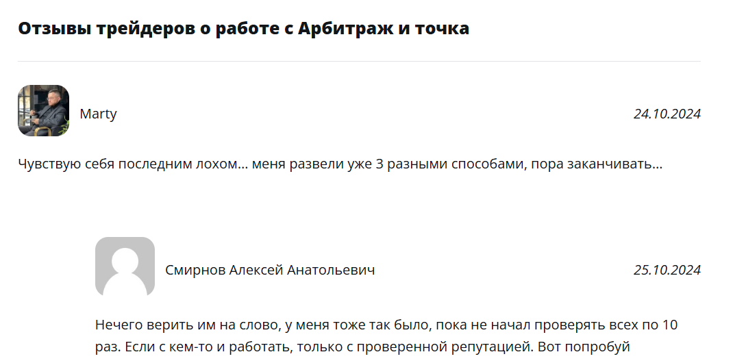 Арбитраж И Точка — это настоящий скам. Они обещают огромные прибыли, но на деле оказываются просто мошенниками. Никогда не рекомендую связываться с этой компанией. По отзывам в сети могу сказать , что они обманули уже множество людей и продолжают это делать. Будьте осторожны и избегайте подобных ненажежных предложений. Не рекомендую к сотрудничеству.