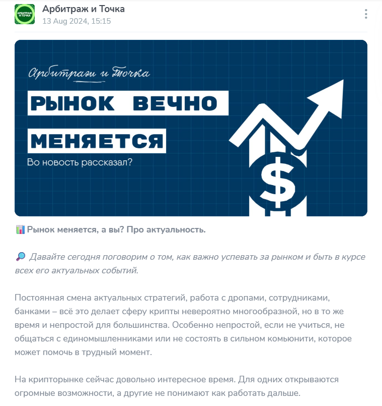 Первое, на что обращаешь внимание, у сообщества было несколько никнеймов – ArbDots, Arbitriym Kanal, CryptoDotp2p и ArbitrageAndTochka. Какая от этого польза, кроме конспирации, понять сложно. С лета 2024 лента не обновляется, последний пост – от 13 августа. Причина, по которой команда перестали вести канал может быть только одна: мошенники сменили площадку.