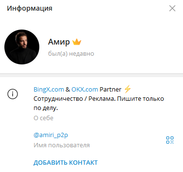 Проект может быть связан с обманом новичков в крипте. Связки Амир предоставляет только в личных сообщениях. Там же он может узнать у потенциальной жертвы об имеющемся у нее опыте.