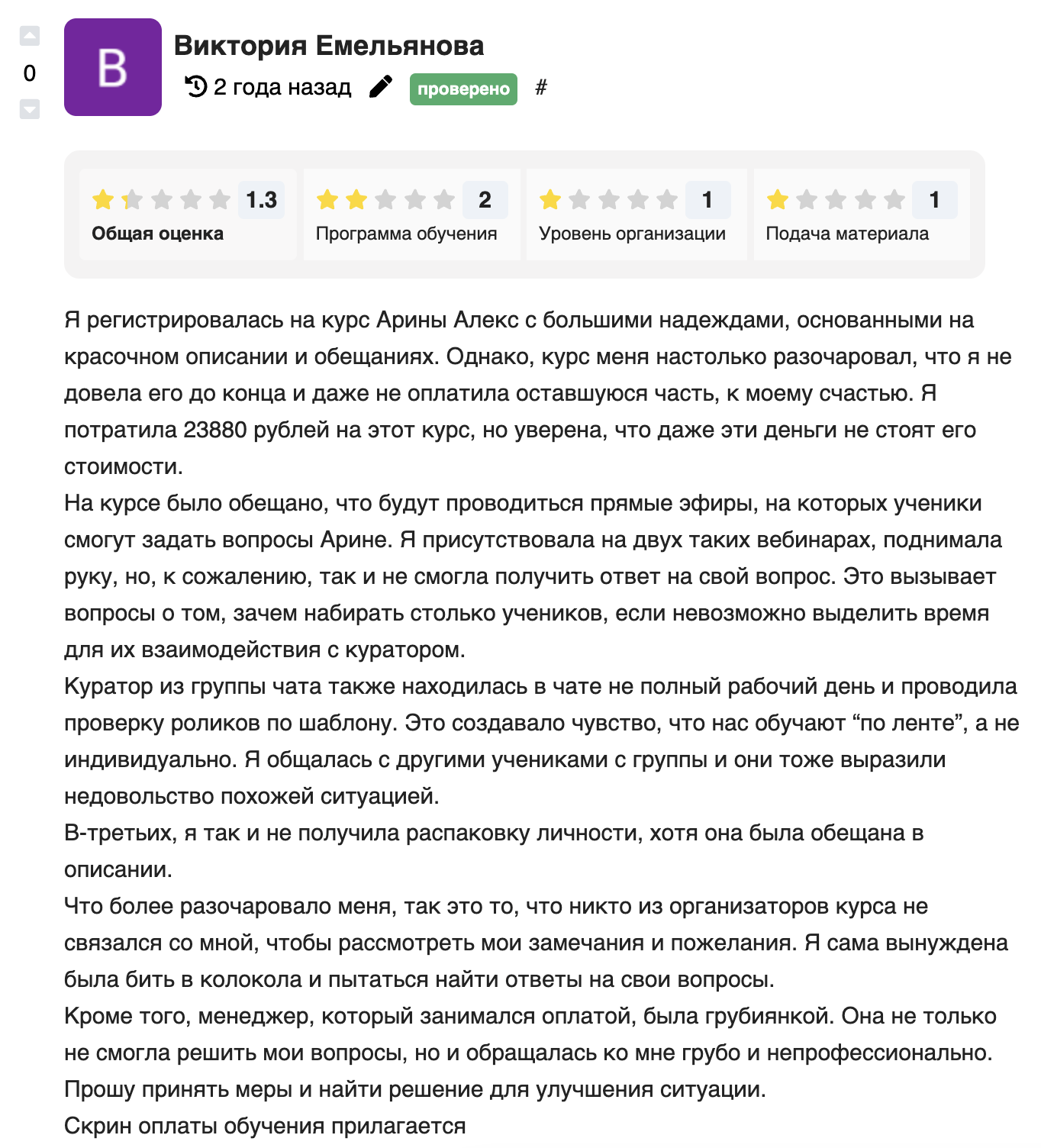Несмотря на то, что на площадке проекта можно встретить большое количество позитивных отзывов, только посмотрев фидбек пользователей на сторонних ресурсах можно узнать правду о рилс курсе Арины Алекс. Люди жалуются на плохую структуру курса, а также бесполезную информацию, которая не имеет никакой прикладной информации в реальном мире. Кроме письменного формата отзывов, много людей записывают видео разоблачения курса Арины Алекс на ютуб и в тик ток.
