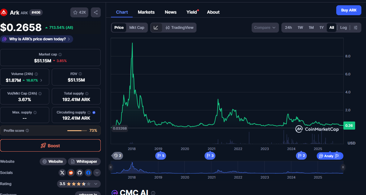 Тотал саплай токена АРК – 192,41 миллиона монет. Столько же находится в обращении. Максимальная эмиссия не установлена. Если посмотреть на график курса монеты, то он выглядит не самым вдохновляющим: