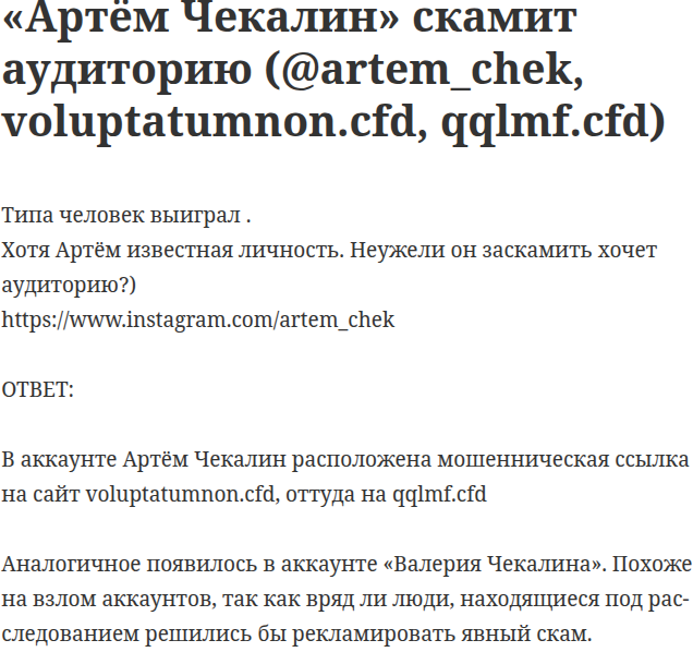 - Аккаунт Артема Чекалина взломали, публикации с розыгрышами были результатом действий мошенников.