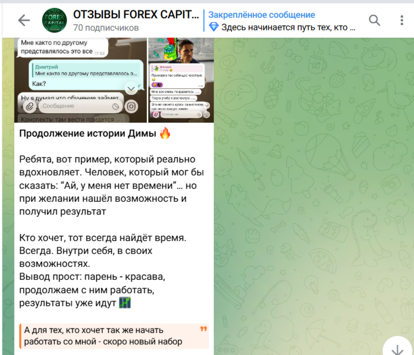 Админ ресурса о трейдинге Артем Дровин приглашает всех желающих в свое комьюнити трейдеров. Здесь он обещает научить своих подписчиков вкладывать финансовые инвестиции в сделки на рынке Форекс и таким образом зарабатывать хорошие деньги. Для увеличения числа последователей автор использует телеграм-канал «Отзывы Forex Capital». Здесь он публикует мотивационный контент: