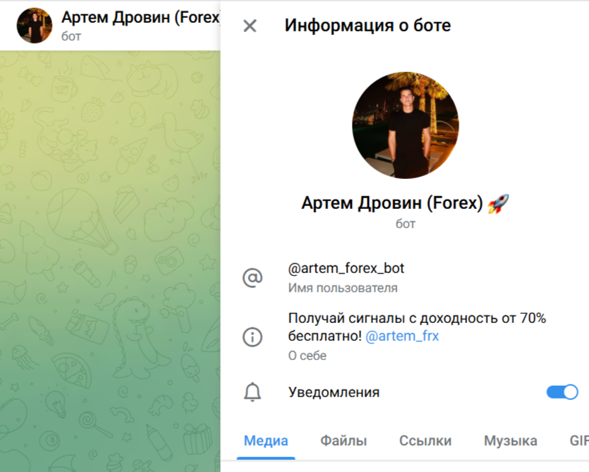 Автором телеграм-канала artem forex bot выступает некто Артем Дровин. И это вся информация о сомнительном трейдере. Персонаж, который обещает научить всех желающих азам прибыльной торговли, не желает раскрывать официальную информацию, рассказывать о профессиональных достижениях, знакомить со статистикой сделок, лицензией и т. п..