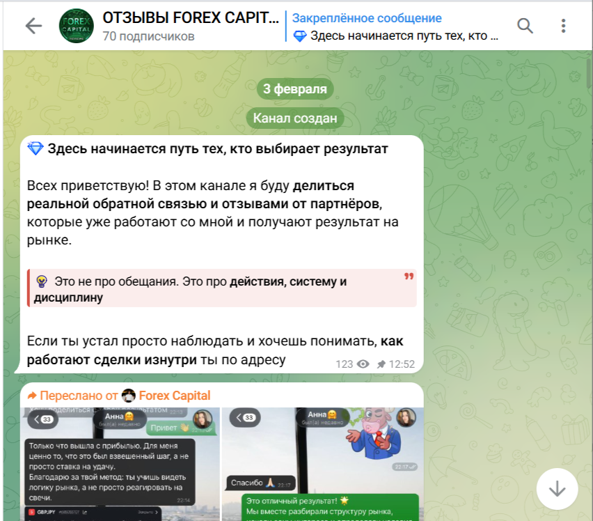 Телеграм-канал artem forex bot ориентировочно был основан в феврале 2026 года. Такой вывод можно сделать на основании даты создания ресурса Артема «Отзывы Forex Capital». Данный проект появился в мессенджере 03 февраля 2026 года. Он имеет 70 подписчиков, половина из которых интересуется бесполезными для трейдеров публикациями автора.