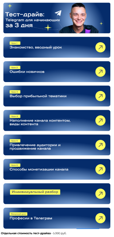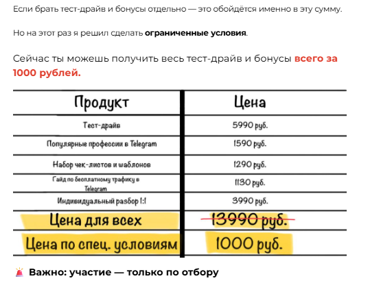 Артем заявляет, что стоимость его тест-драйва составляет ₽5,990, а с учетом бонусов и дополнительных материалов цена доходит до ₽13,990. Цифры ничем не подкреплены и взяты с потолка, что подтверждается предложением приобрести курс всего за ₽1,000 в рамках специальной акции.