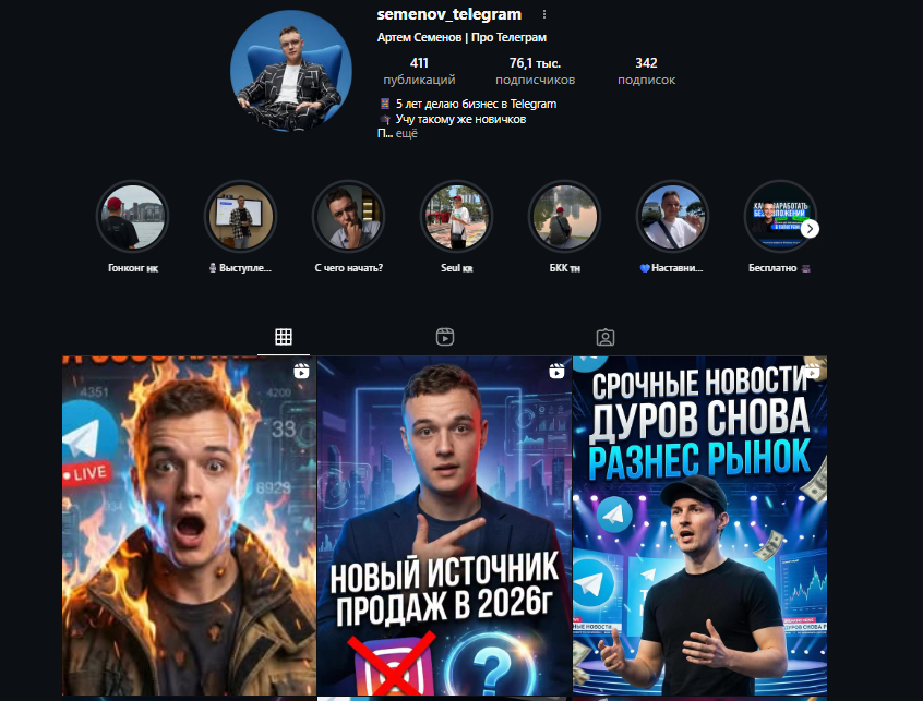 Кроме телеграмм-канала, у Артема есть аккаунт в Instagram, на который подписано больше 76 000 человек. В рамках этого ресурса Семенов также рассказывает о своей деятельности, а также делится историями из личной жизни.