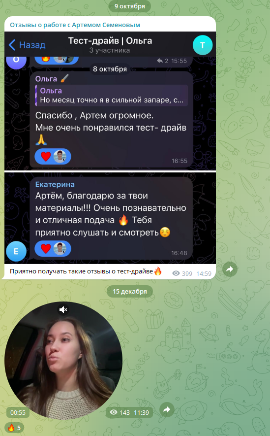 Этот так называемый «предприниматель» Артем Семенов продает курсы по заработку в Telegram, но не предоставляет никаких доказательств своей компетентности. Стоимость его «тест-драйва» варьируется от 5 990 до 13 990 рублей, причем цены, похоже, взяты с потолка. Отзывы на его канале невозможно проверить, а в сети отсутствуют независимые мнения о его продуктах. Судя по всему, он просто наживается на доверчивых людях, предлагая сомнительные схемы без реальной ценности. Не рекомендую связываться с этим проектом.