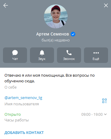 Чтобы лично связаться с Артемом Семеновым в «Телеграм», можно написать на страницу @artem_semenov_tg, так как это личный профиль предпринимателя. На сообщения он отвечает самостоятельно или пользуется услугами помощницы, если судить по описанию, но дополнительной информации в профиле нет.