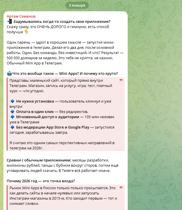 Тест-драйв Артема Семенова в «Телеграм» кажется обычным информационным продуктом, который вряд ли заслуживает отдельного внимания и действительно поможет подписчикам заработать.