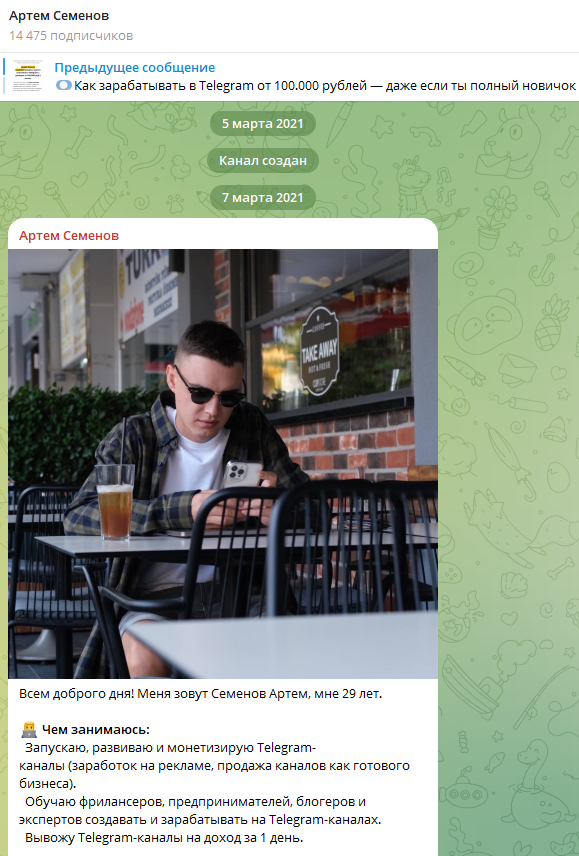 На своем канале Артем рассказывает о разных методах заработка в «Телеграмм», предлагая аудитории не терять момент и заняться делом.