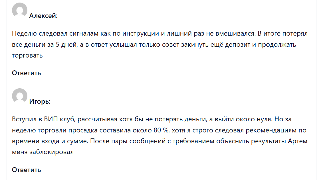 В сети редко встречаются отзывы о Artem Trade House. Это связано с тем, что канал существует короткий промежуток времени и обладает относительно низким уровнем популярности среди аудитории. Люди утверждают, что трейдер дает им сигналы и объясняет принципы торговли. Если у кого-то не выходит, то он говорит об отсутствии дисциплины, неточном выполнении указаний и советует закинуть больше денег на депозит для продолжения.