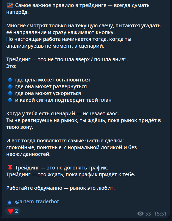 В Телеграме Артем Волков начал вести канал относительно недавно. Он сразу публикует для подписчиков развернутые сообщения и заметки о трейдинге. Как правило, они содержат общую информацию о вопросах философии и психологии торговли, как проводить начальный анализ рынка. Также тут говорится об общих нюансах поведения стоимости активов, основные изменения на графиках и как на них реагировать. Трейдер говорит о необходимости развития, фиксировании результатов своей работы, этапов роста и других общих понятиях.