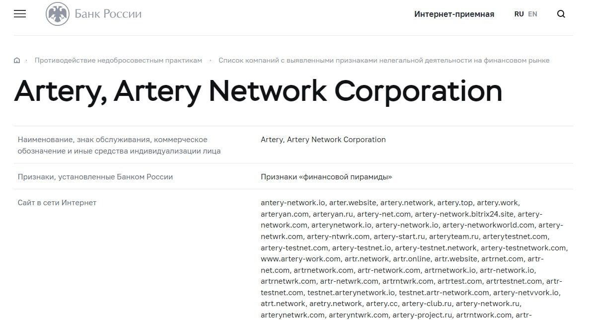 Сразу стоит обратить внимание на то, что данные размещенных якобы лицензий фейковые. Кроме того, Artery Network (Артери Нетворк) занесена Центробанком России в реестр компаний, имеющих признаки финансовой пирамиды.