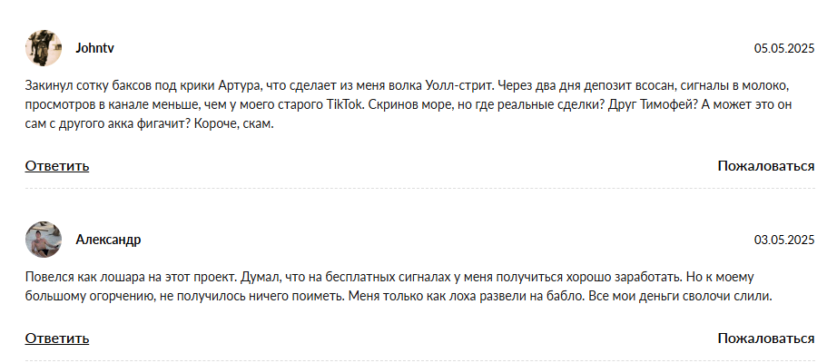 Но отсутствие негативных комментариев может говорить о том, что автор просто старательно их подчищает. Именно поэтому мы обратились к независимым форумам и рейтинговым ресурсам. Там картинка вокруг трейдера Артура сложилась несколько иная. В большинстве отзывов те, кто решил торговать по его сигналам, писали о том, что просто слили свои депозиты и не получили никакой прибыли.