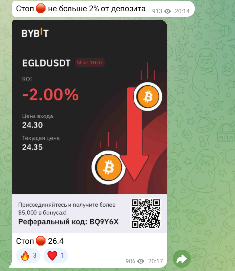 Ранее он был целиком посвящен торговым сигналам, которые автор выкладывал в ленте бесплатно. Не называть их финансовыми рекомендациями достаточно сложно, а на это у автора нет разрешения. Все сигналы он давал для платформы ByBit, а также делился своей реферальной ссылкой для регистрации на этой бирже. Это указывает на то, что хоть советы и были бесплатными, трейдер неплохо зарабатывал с них за счет отчислений торговой платформы.