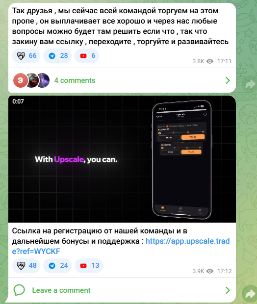 В качестве примера промо-публикации можно привести информацию про проп-трейдинговую компанию UpScale. Ее упоминание включает в себя реферальную пригласительную ссылку, чтобы автор мог монетизировать свой контент.