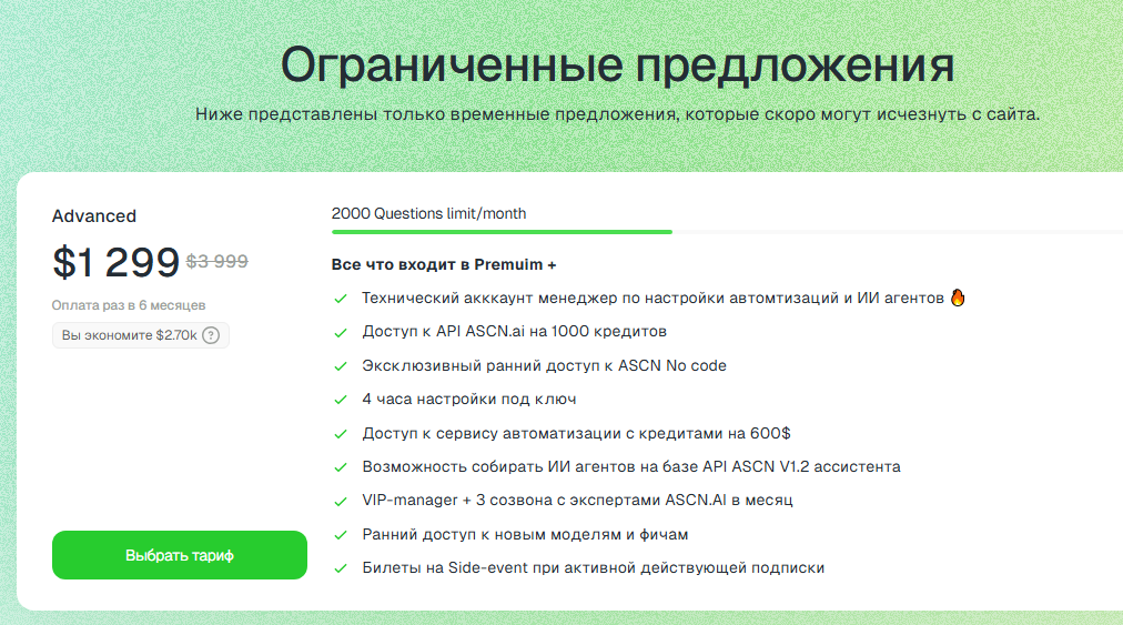 - Advanced — $1299 за 6 месяцев. Тариф предоставляет лимит 2000 вопросов в месяц и включает полный комплекс услуг из категории Premium.