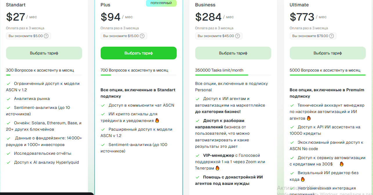 - Standart стоит $27 в месяц включает 300 запросов, базовый доступ к модели ASCN v1.2, аналитику рынка, sentiment-анализ до 10 источников и ончейн-данные по 20+ блокчейнам.