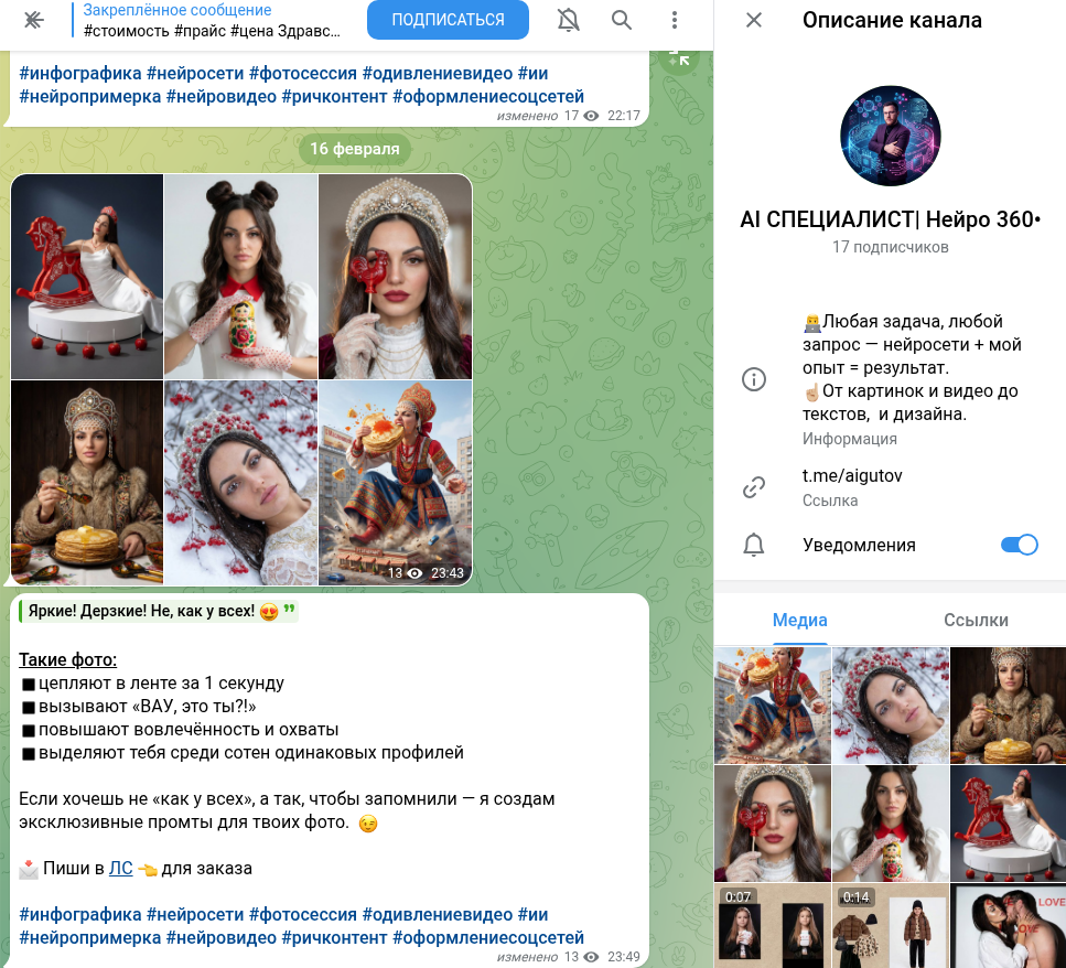 В Телеграме у Гутова есть канал AI СПЕЦИАЛИСТ| Нейро 360•. Там 17 подписчиков. Согласно описанию, в этом проекте «любая задача решается через нейросети и опыт автора. От картинок до текстов и дизайна». То есть здесь Аслан продает свои услуги по генережке.