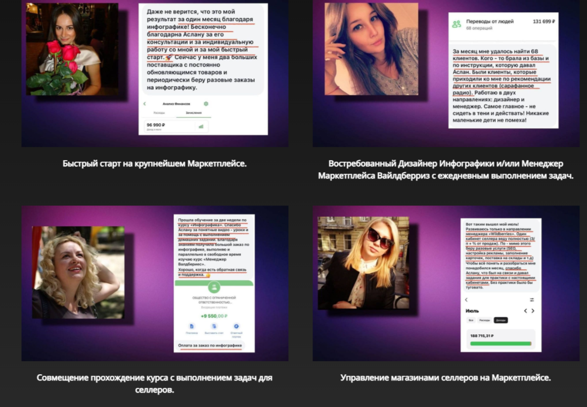 Обучение Аслана Гутова построено на собственном опыте торговли на Вайлдберриз, акцент на практику. На каждый модуль есть куратор с релевантным опытом. Тариф с бесплатным первым месяцем выглядит круто, его можно получить только при оформлении рассрочки. Соцсети у Аслана с малой аудиторией. В них он публикует якобы истории успеха учеников и разные завлекалочки в свои курсы и услуги, но вовлеченность низкая.