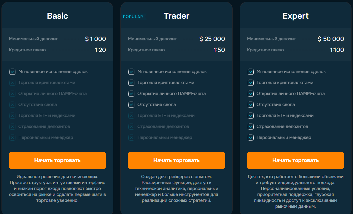 Для старта работы с брокером понадобится минимум $1000, за которые клиент может рассчитывать на единственную опцию — мгновенное исполнение сделок. Более продвинутые тарифы предлагают только тем, кто вносит $25 000 или $50 000. Клиенты с таким капиталом якобы получат более крупное кредитное плечо, возможность открыть ПАММ-счет, застраховать депозит и прочее.