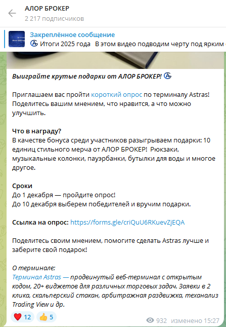 На инвестиционный канал Alorbroker подписано 2 217 юзеров. В сообществе рекламируется ресурс для трейдинга AstrasTerminal.