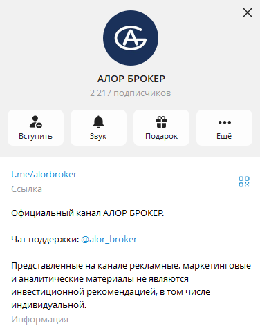 На сайте брокерской компании закреплена ссылка на профиль «Алор» в ТГ.
