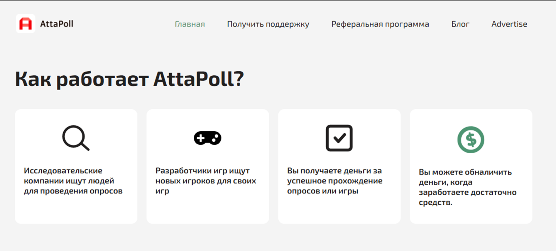 Attapoll – платформа для онлайн-заработка, которая предлагает пользователям проходить опросы, играть в игры и участвовать в партнерской программе. Сколько можно заработать и стоит ли тратить время на данный проект, расскажем в обзоре.