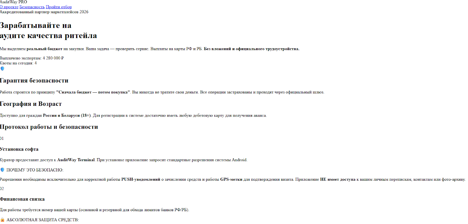 Auditway Pro — очередной скам, замаскированный под «аккредитованного партнера маркетплейсов». Сайт проработал меньше месяца, требовал установки сомнительного приложения и предлагал схему обратного выкупа. Очевидный развод для наивных.