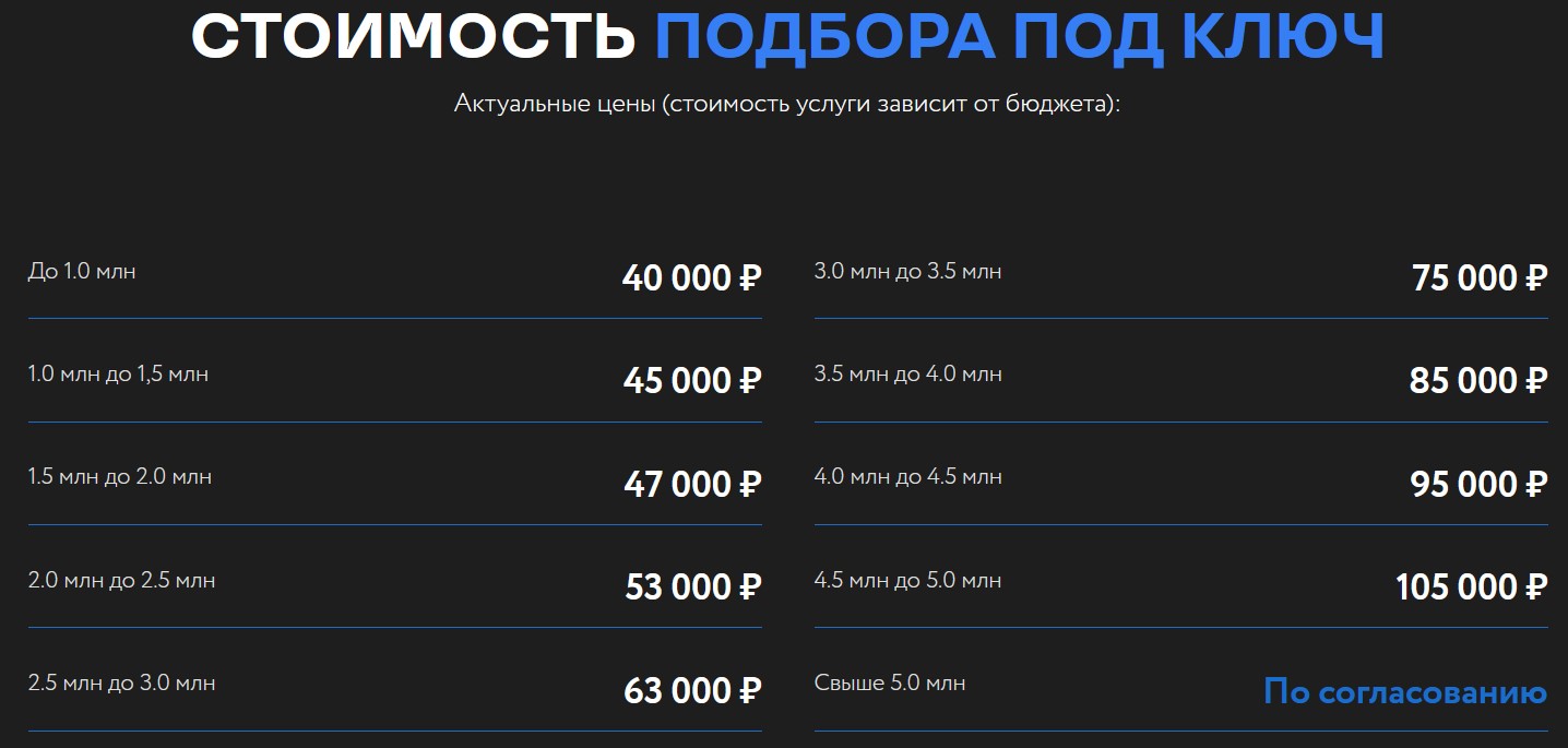 Основной услугой является подбор машин «под ключ». Цена на эту услугу зависит от цены самого автомобиля, варьируется от 40 000 за машину ценой до миллиона рублей до 105 000 за машину ценой 4,5-5 млн рублей. Также можно заказать разовый осмотр машины или вызвать эксперта на целый день за 22 500 рублей.