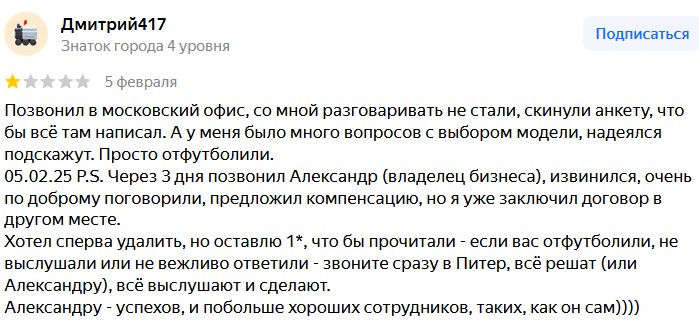 Негативных отзывов мало, удовлетворенных клиентов намного больше, а средняя оценка на Яндекс-картах составляет 5.