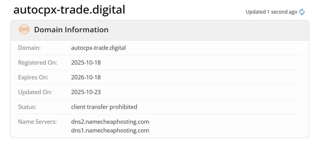 Проверка Autocpx Trade на сайте «Who Is» показывает, что домен был зарегистрирован в 2025 году. Скорее всего его в скором времени поставят на продажу.