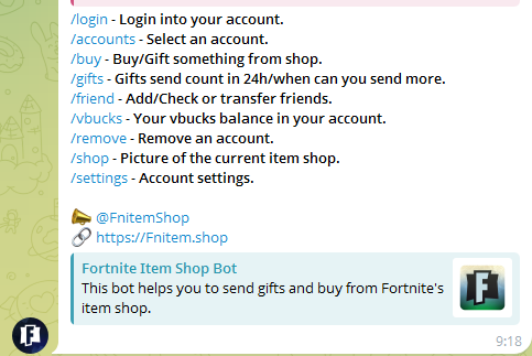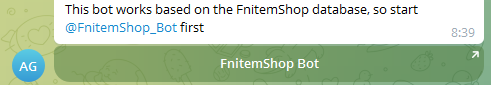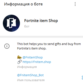 В профиле бота находится ссылка для открытия доступа к магазину. При запуске роботизированного сервиса пользователям предлагается перейти на ресурс @FnitemShop_Bot.