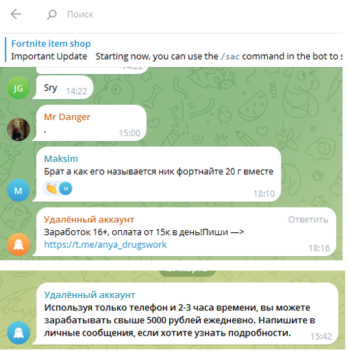 Аккаунты аферистов уже удалены, но ссылка на скам-сервис опубликована в общественном месте, что представляет собой угрозу для доверчивых граждан. Люди рискуют столкнуться с обманом в телеграм-канале «Фортнайт Итем Шоп».