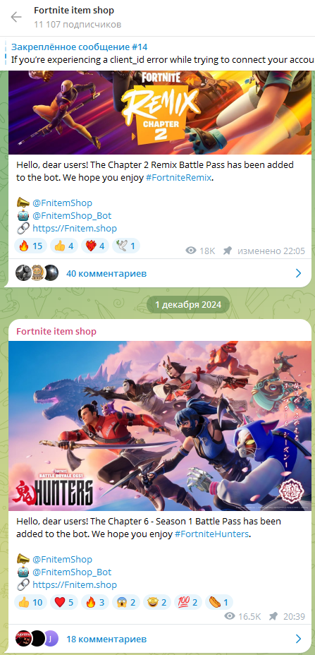 В обсуждениях под постами на канале «Фортнайт Итем Шоп» мы обнаружили, что подписчики жалуются на отсутствие работоспособности телеграм-магазина.