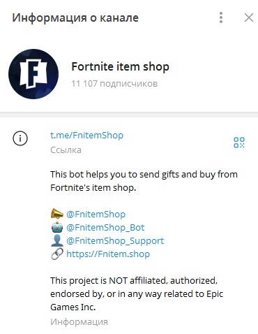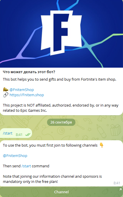 - доступ к функциям маркета открывается только после подписки на телеграм-канал «ФортнайтШоп»;